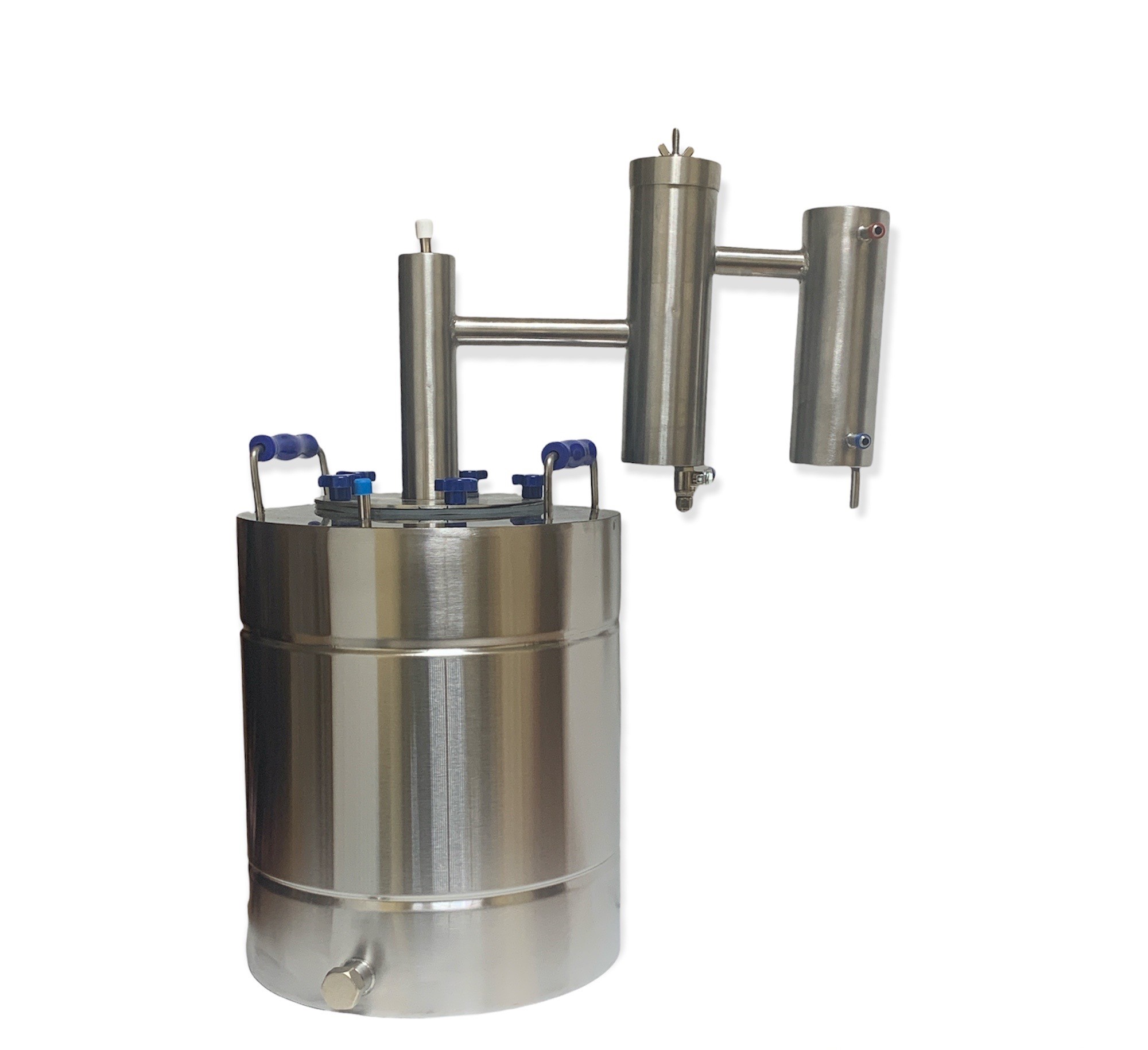 С помощью дистиллятора «ТРОЙКА» Вы гарантированно получите продукт достойного качества. Дистиллятор «ТРОЙКА» представляет собой комплект оборудования домашней винокурни, состоящей из мини-колонны, сухопарника, а также вертикального холодильника, имеющего узел отбора дистиллята и штуцеры подвода и отвода охлаждающей воды. Мини-колонна и сухопарник позволяет повысить степень очистки дистиллята и крепость продукта. В холодильнике пар движется сверху вниз по змеевику диаметром 8 мм и длинной 1200 мм, конденсируется на внутренней поверхности стенок змеевика и стекает по штуцеру, расположенному в нижней части холодильника и силиконовой трубке в емкость. Охлаждающая вода движется во внутренней полости холодильника. Данное исполнение обеспечивает необходимую производительность при небольших габаритных размерах, а также обеспечивает наименьшее гидравлическое сопротивление воды, что позволяет использовать автономное охлаждение и небольшие аквариумные насосы воды. Подвод воды к аппарату и ее отвод осуществляется при помощи ПВХ шлангов. Простота и надежность этой модели делают ее доступной даже для начинающих винокуров. Наличие дополнительных устройств позволяет наращивать функциональность системы.